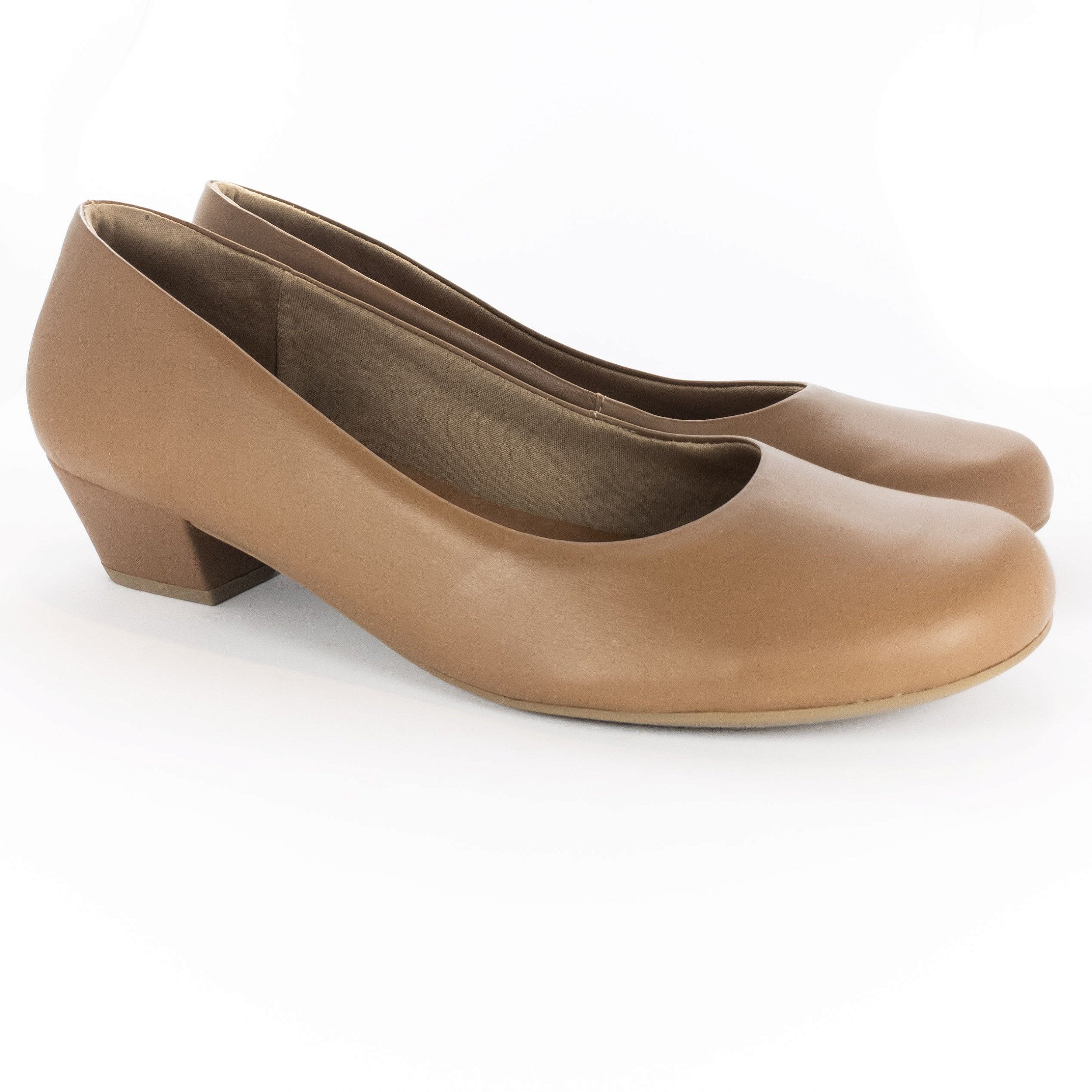 Sapato Usaflex Scarpin Salto Baixo Camel, couro camel, salto bloco baixo que permite maior estabilidade ao caminhar. Confira as tecnologias: